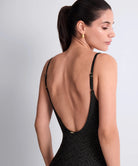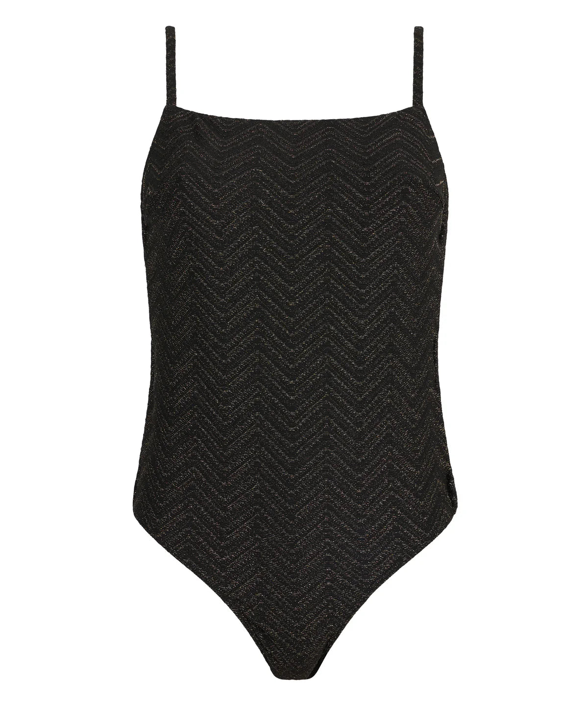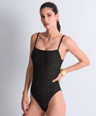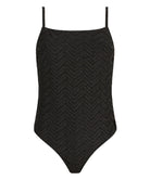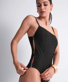 Tijdloos zwart met een verfijnde gouden shimmer: het Golden Horizon Badpak straalt pure elegantie uit. De combinatie van diepzwarte stof en subtiel mesh met metaaldraad zorgt voor een luxe, vrouwelijke uitstraling die prachtig glanst in de zon.