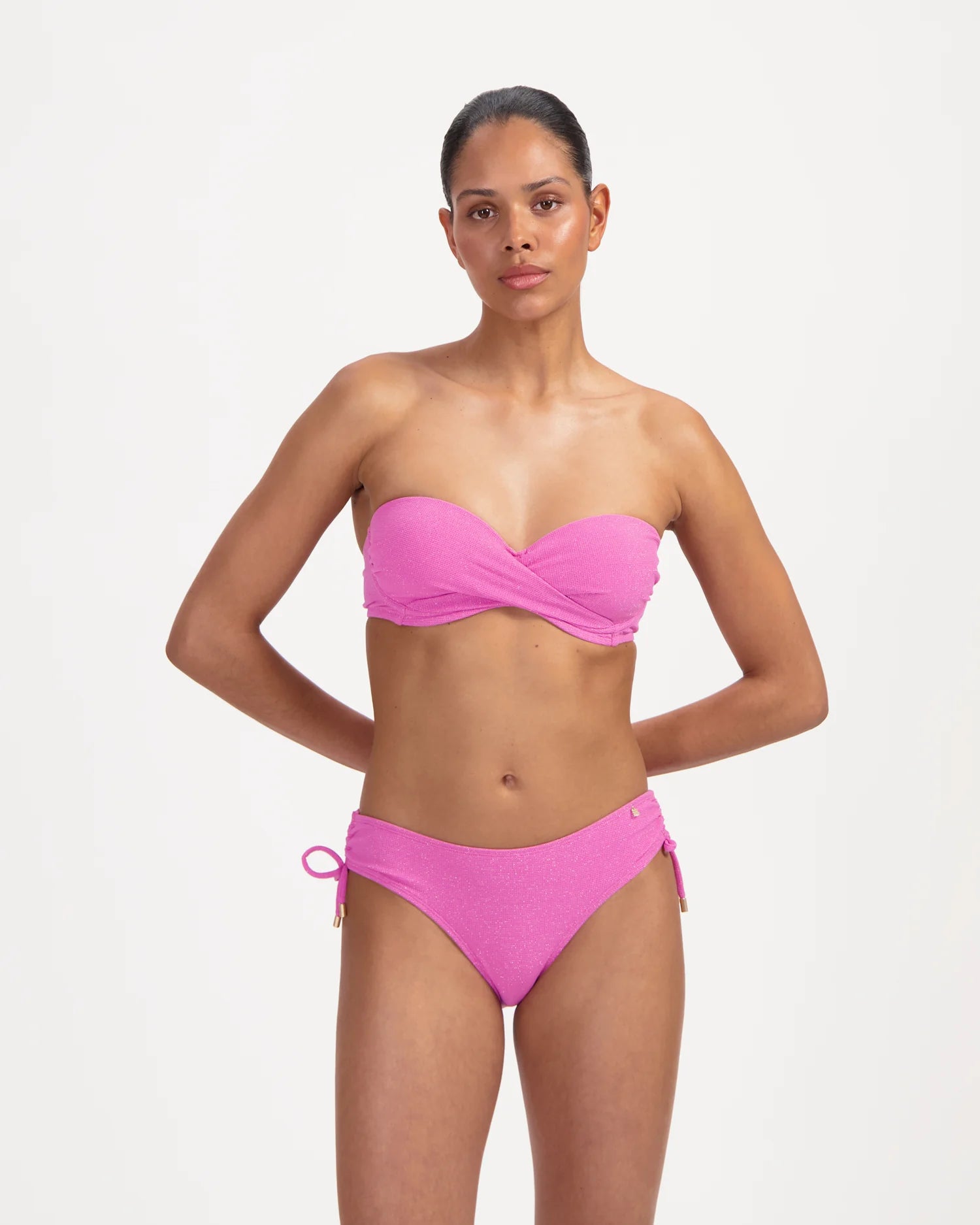 Deze roze glitter bikinitop is een echte eyecatcher en combineert glamour met functionaliteit. De voorgevormde cups en beugel zorgen voor mooie lift en stevige ondersteuning, terwijl de bedekte fit zorgt voor een comfortabele, zelfverzekerde look. Het twist detail aan de voorkant geeft de top een elegante, vrouwelijke touch.