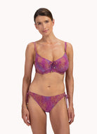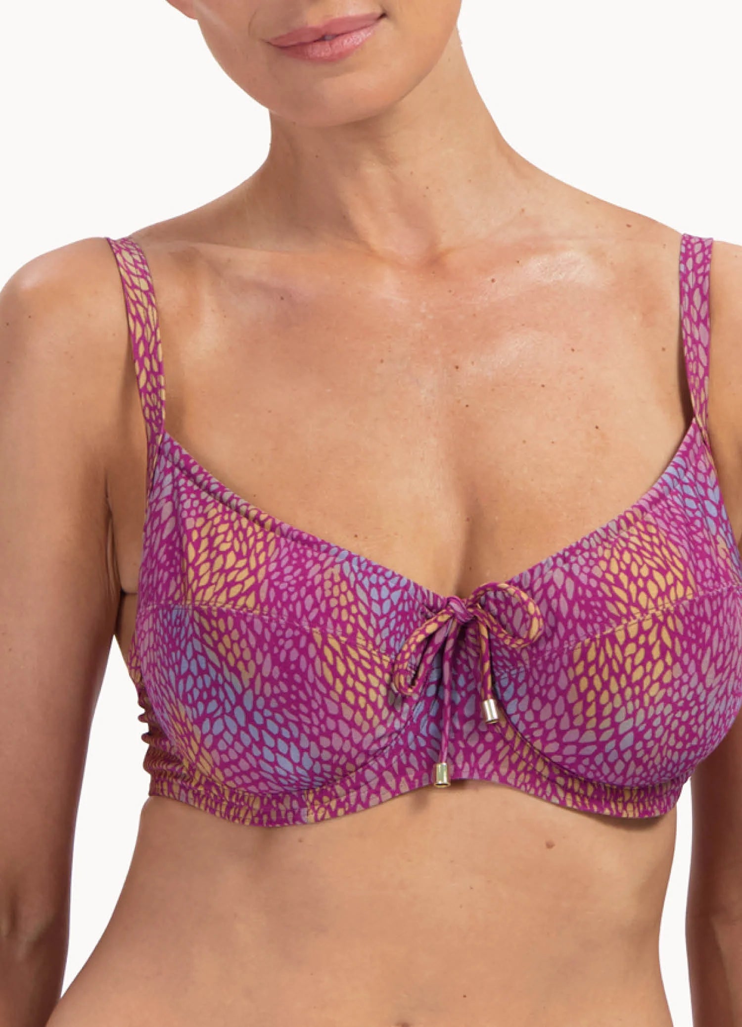 De verstelbare schouderbandjes maken het eenvoudig om de pasvorm aan te passen aan jouw lichaam. Met de verstelbare aansnoerkoordjes bij de cups bepaal je zelf de mate van bedekking, terwijl ze tegelijkertijd een speels detail toevoegen aan het design. De meerkleurige print met bordeauxrode tinten geeft de top een luxe, zomerse uitstraling en maakt hem perfect om te combineren met een bijpassend bikinibroekje of een uni slip.