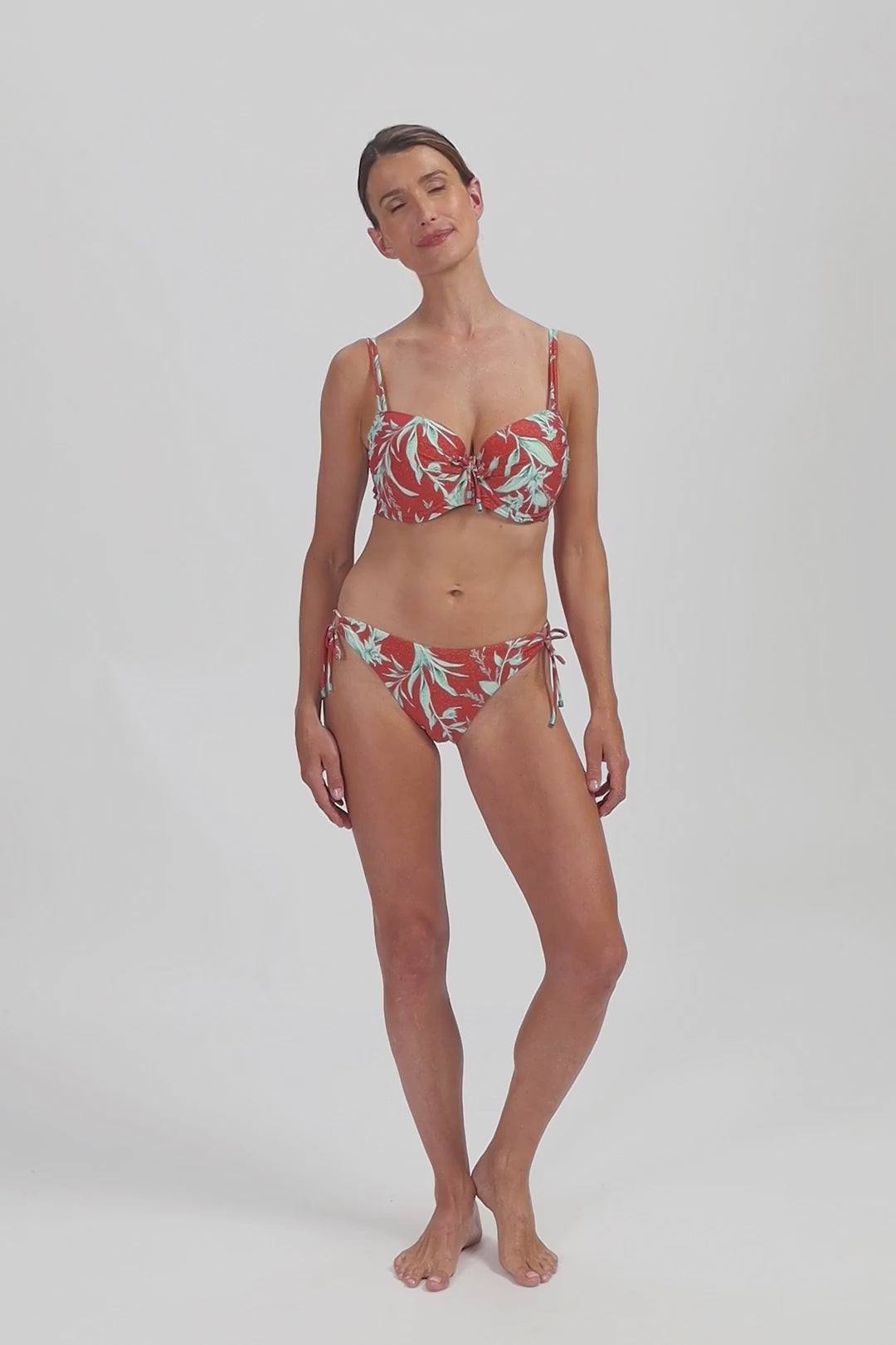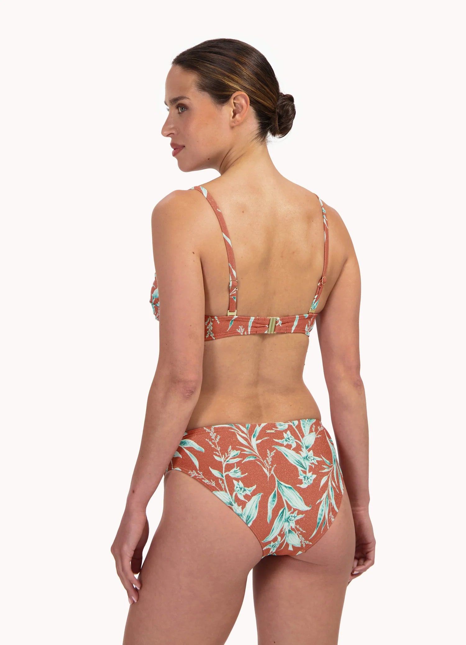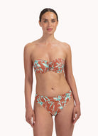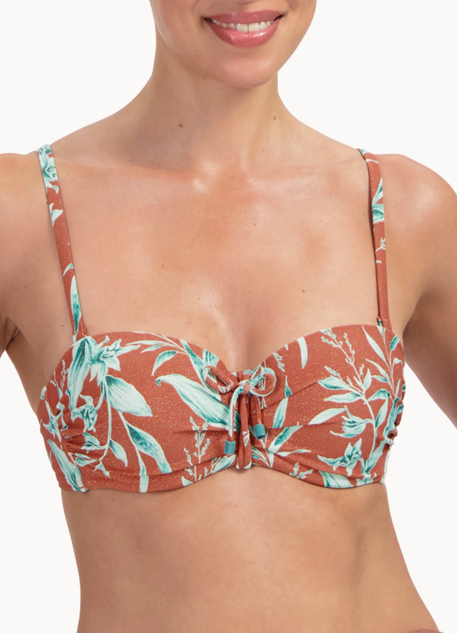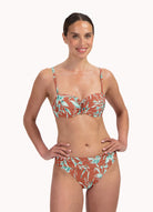 De voorgevormde cups met beugel zorgen voor een mooi decolleté, subtiele lift en stevige ondersteuning – zelfs wanneer je de top strapless draagt. Vanaf cup D zijn de bandjes breder voor extra comfort en support. Het glitter roodbruine materiaal met turquoise print geeft een sprankelende, zomerse uitstraling die opvalt op het strand of bij het zwembad.