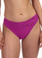 De flatterende plooitjes op de tailleband zorgen voor een lichte camouflerende werking bij de buik, terwijl de intense fuchsia paarse kleur een opvallende, zomerse uitstraling geeft. Perfect te combineren met de bijpassende Texture Viola Bikinitop voor een complete, glamoureuze strandlook.