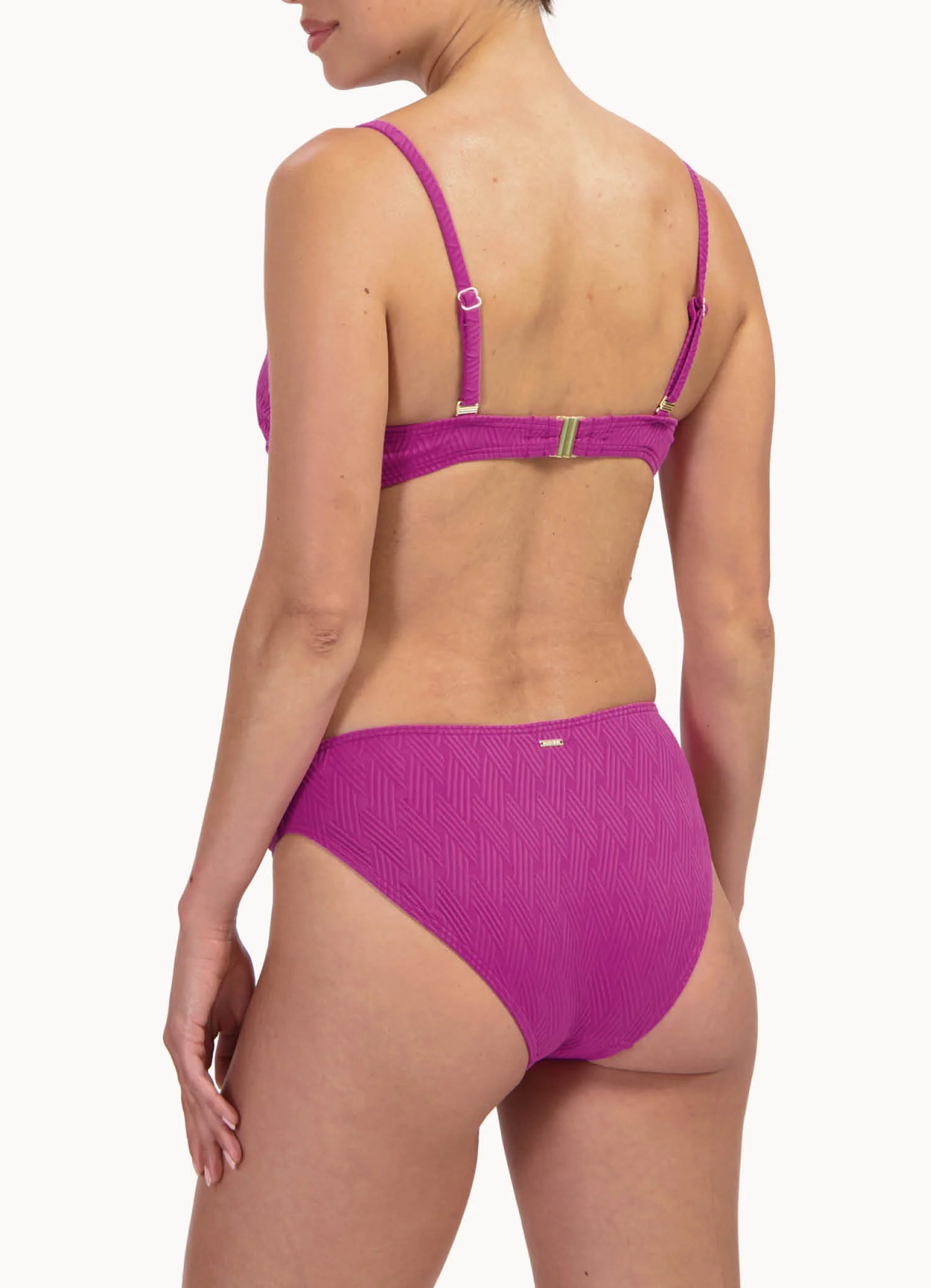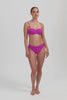 Het Texture Viola Bikinibroekje met Plooien combineert een elegante pasvorm met een subtiel corrigerend effect. Het broekje valt net boven de heupen (middelhoge taille) en biedt medium bedekking van de billen.