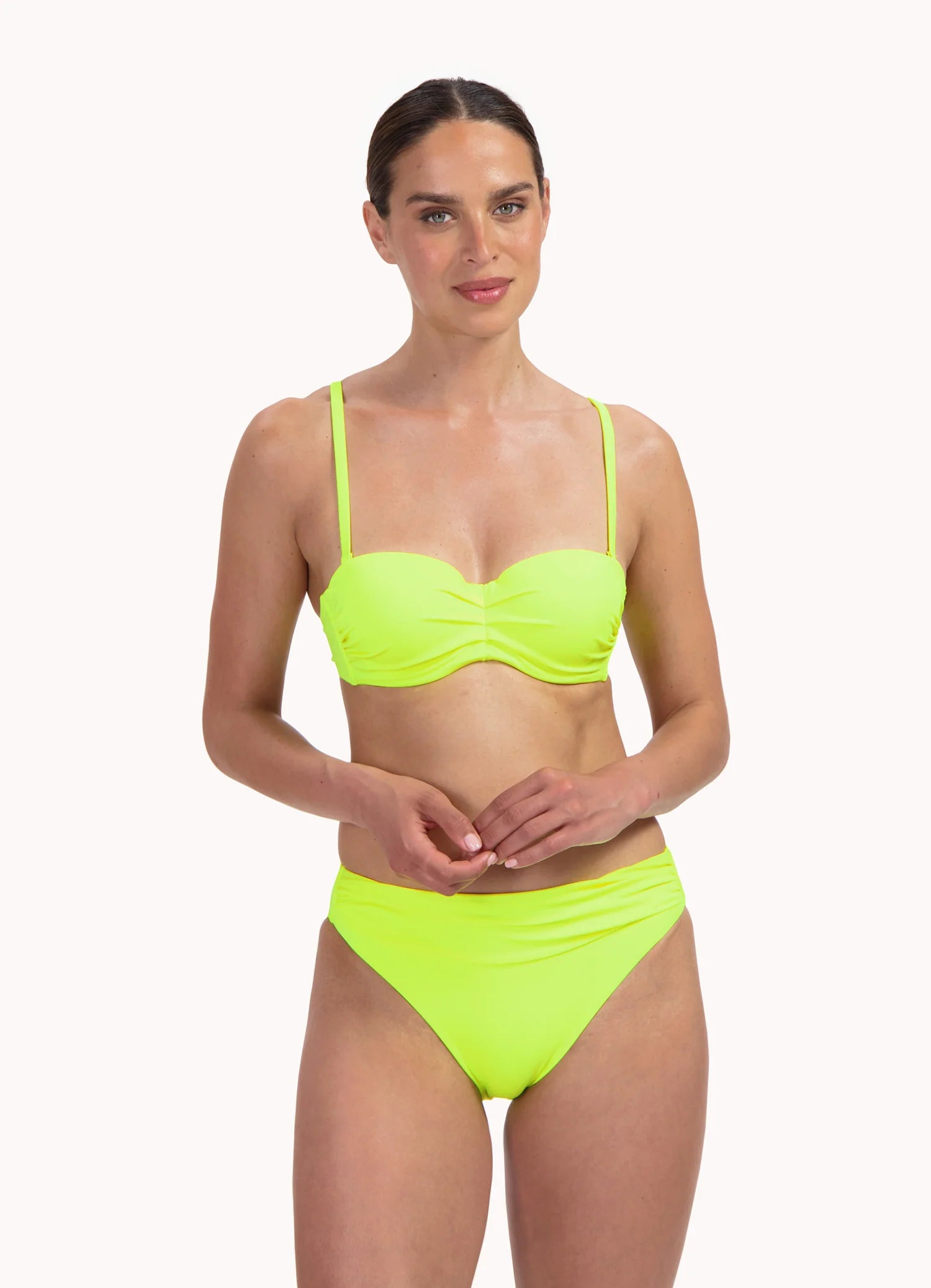 De bikinitop biedt een subtiel liftend effect en een mooi decolleté. Dankzij de beugel en voorgevormde cups biedt hij stevige ondersteuning, zelfs strapless. Draag hem strapless, als halter of met rechte schouderbandjes – zo kies jij hoe jouw schouders en decolleté het beste uitkomen. Vanaf cupmaat D zijn de bandjes breder voor extra comfort.