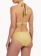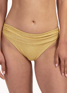 Dit elegante bikinibroekje uit de Cyell Golden Hour collectie heeft een middelhoog taille­model en biedt medium bedekking op de billen. Flatterende plooitjes op de tailleband accentueren je silhouet en verdoezelen subtiel een klein buikje. Uitgevoerd in sprankelend goud glitter en gemaakt van 93% polyamide en 7% elastaan voor een comfortabele, stijlvolle pasvorm. Model is 1,78 m en draagt maat 38.