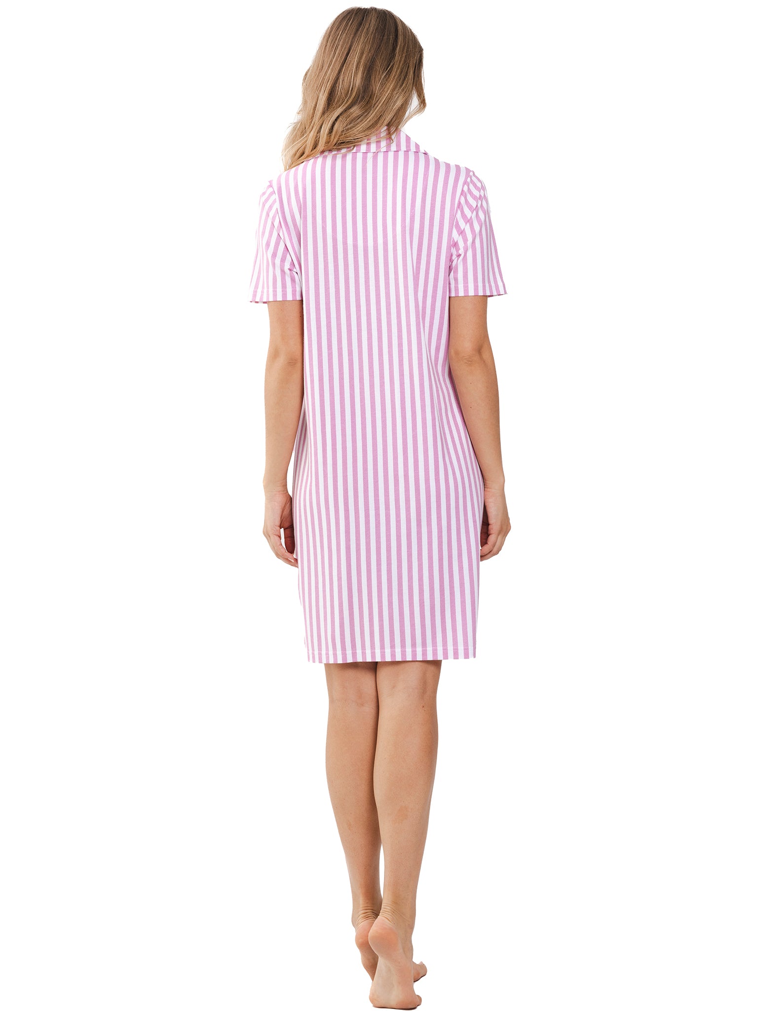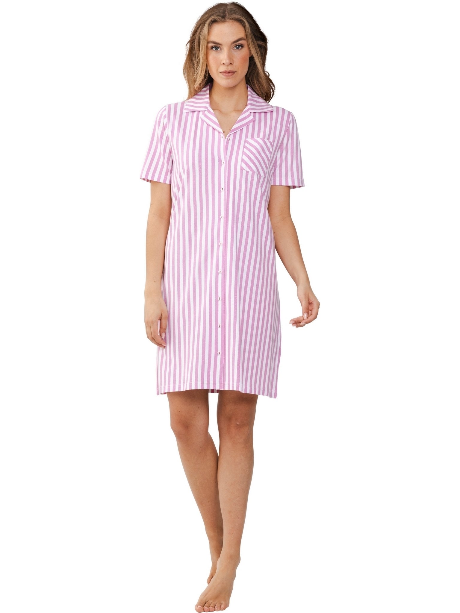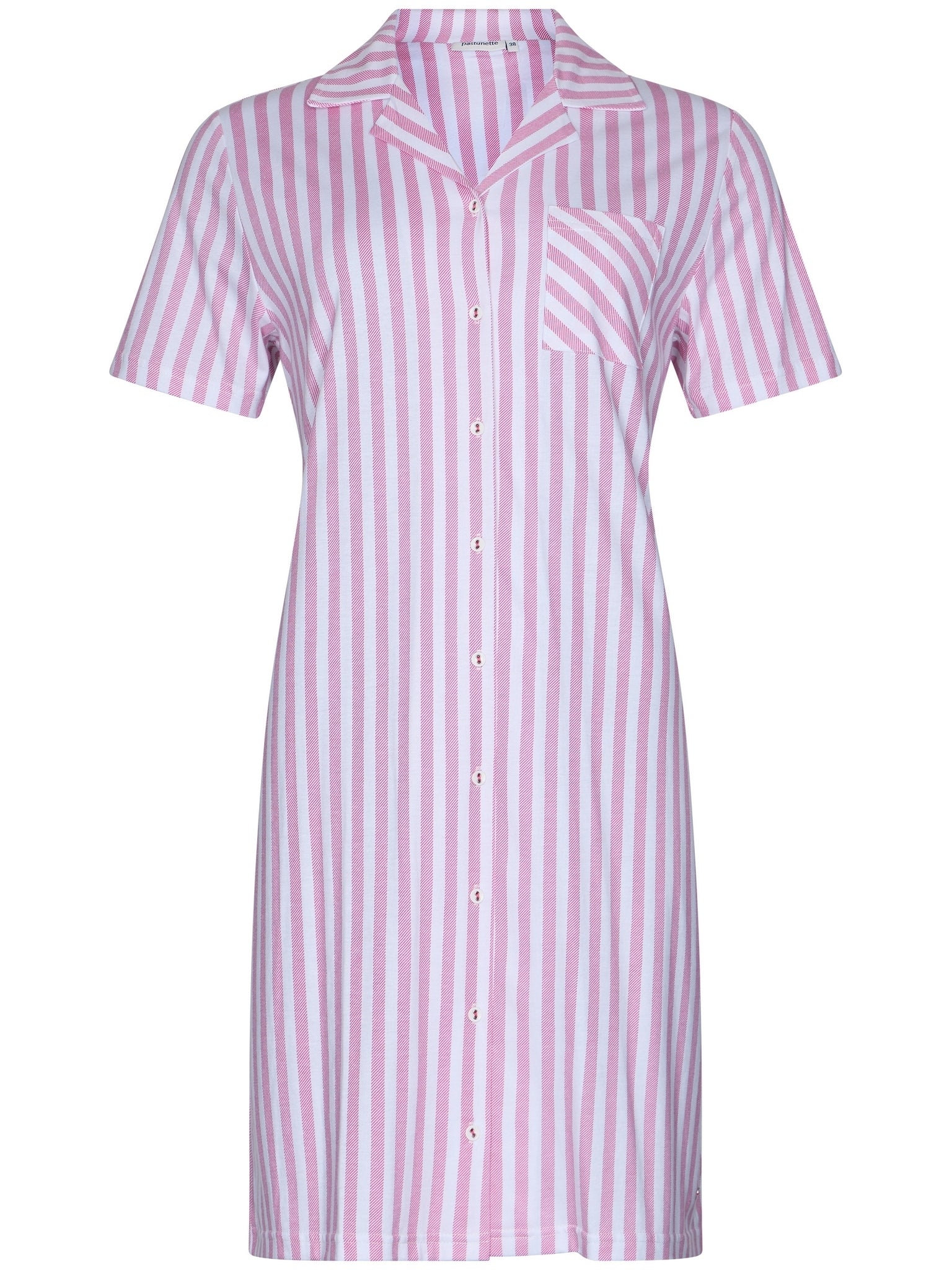 Dit mooie nachthemd komt uit de Pink Dream serie van Pastunette. Het nachthemd heeft een wit met roze gestreept patroon, en is voorzien van een doorknoopsluiting, korte mouwen en een reverskraag. Een leuk detail is het borstzakje, dat het streepdessin in diagonale richting toont, wat het een speelse uitstraling geeft.