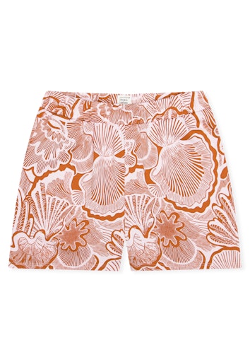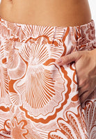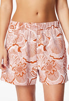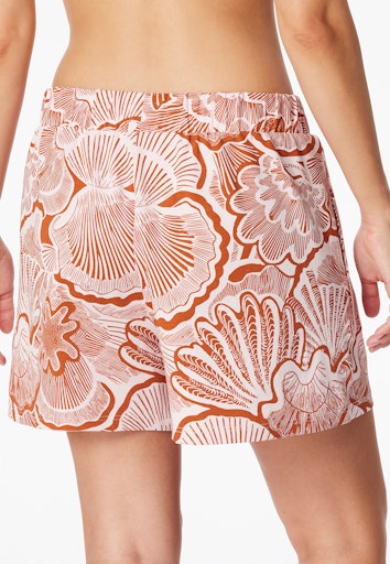Deze korte damesshort uit de Schiesser Mix+ Relax-serie valt op door de grote, abstracte schelpenprint in terracotta en rosé. De short is gemaakt van hoogwaardige, zware Single Jersey-stof en heeft een moderne, wijde snit met hogere taille, waardoor hij comfortabel en stijlvol zit. De zijkanten zijn voorzien van praktische zakken. Perfect om te combineren met andere items uit de Mix+ Relax-collectie voor een complete lounge- of casual look.