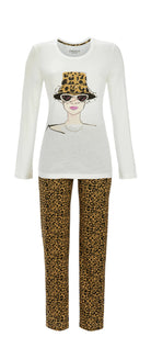 De Ringella damespyjama met print is perfect voor gezellige nachten en ontspannen ochtenden. Het unicolor bovenstuk met klassieke ronde hals biedt comfortabel draagcomfort, terwijl de broek met dierenprint en motief van vrouwenhoofd met hoed een stijlvolle eyecatcher is. Gemaakt van 100% katoen in zachte single jersey-kwaliteit, voelt de pyjama zacht en ademend aan en is gemakkelijk te onderhouden. Ideaal voor een comfortabele en modieuze nachtrust.