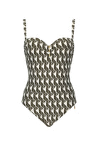 Elegant badpak met wit-olijf ruitpatroon en gouden details. Strapless te dragen, voorgevormd met beugel voor optimale ondersteuning en een flatterende pasvorm. Perfect voor een stijlvolle strand- of zwembadlook.
